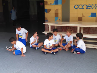 Nossos alunos se divertindo e aprendendo inglês, em uma aula de perguntas e respostas, realizada no pátio do Colégio.
